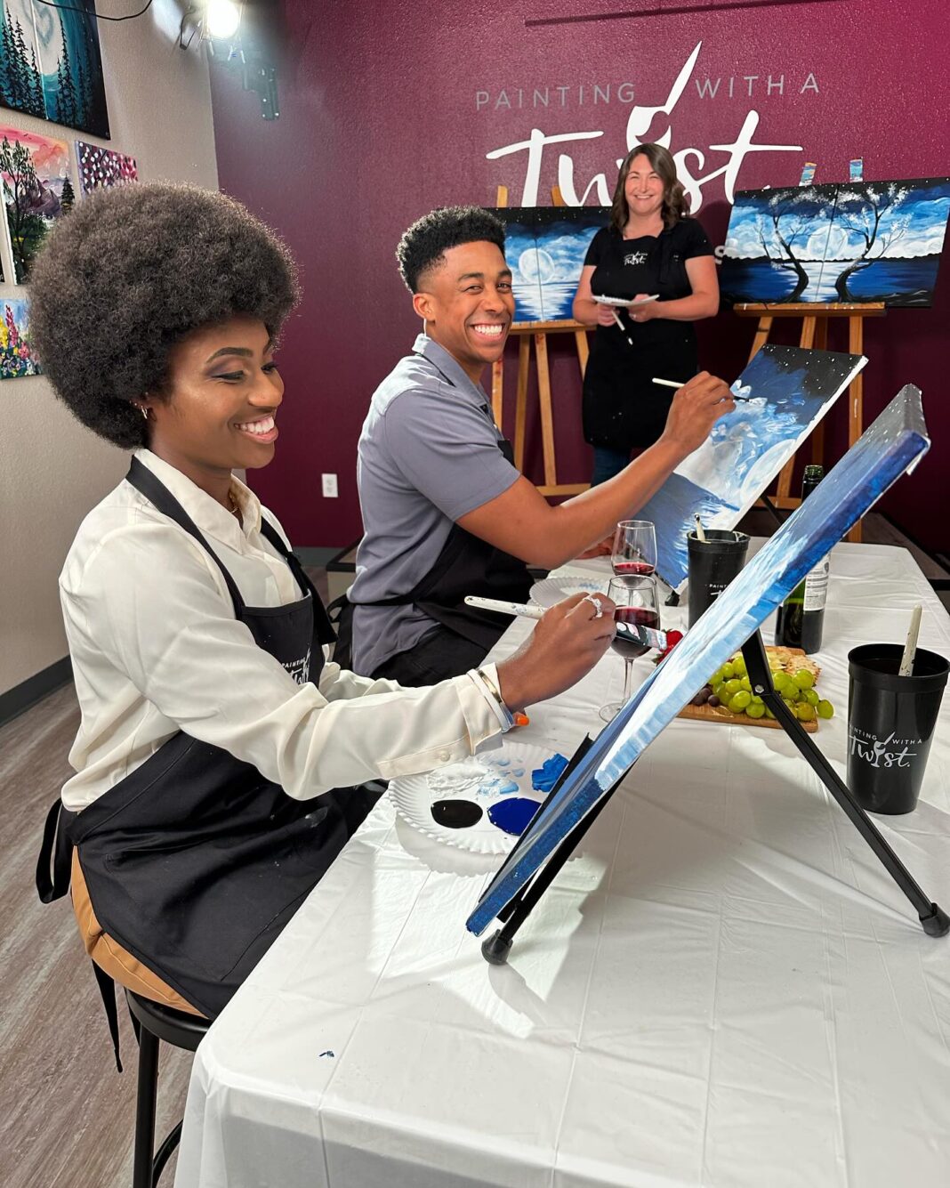 Painting with a Twist is a sip and paint experience at its finest. Choose from themed nights like date nights, paint your pet nights, trivia night, or girls night out. Some painting examples include flower scenes, sunsets and moons, cartoon animals, and much more.