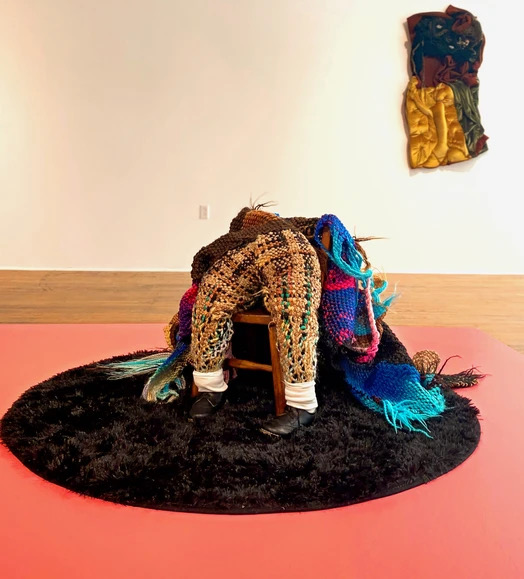 A work by Akudzwe Elsie Chiwa with velvet in yellow, dark earth tones, green, and black