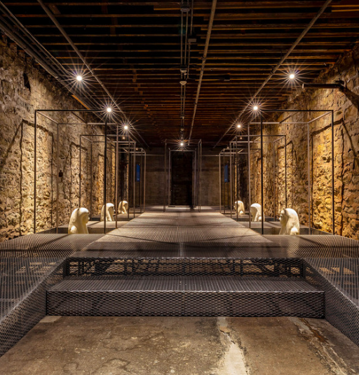 Echoes to Omega is a remarkably complex work, as spacious and multi-faceted as the dark room that holds it. It plays with the senses from all angles. Your eyes adjust to the dark. Water drips from a pipe, footsteps echo across the floorboards above. The smell of sandaliya wafts through the room. You can feel the slight creak of the steel mesh that makes up the floor. Perhaps if you licked the bisque, you could taste the exhibition, but that would be ill-advised and probably result in getting escorted from the premises.