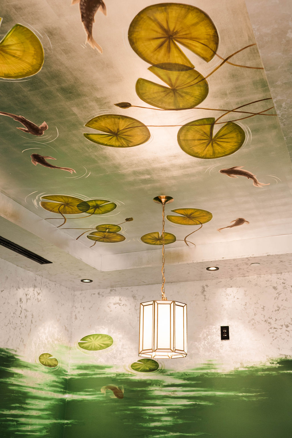 The lily pad ceiling has been a motif I’ve wanted to execute for some time! They were inspired by my contemporary Henry Van der Vijver and reinforced by our exploratory trip to Phipps Conservatory. The idea initially started with part of the ceiling but quickly escalated to the entire ceiling and extending the silver gilding down the walls, drawing the guests to look at the walls but really wow them with the ceiling!