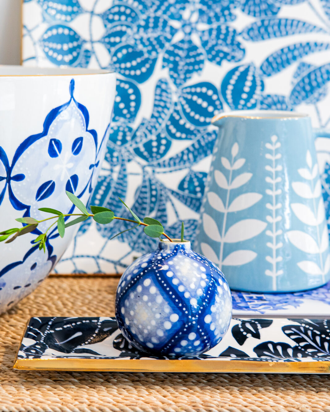 This new Shadyside boutique and design firm loves to develop a sense of narrative in their client installations and in-store selections. Here, a gorgeous layering of blue and white patterns tells a comfortable story of freshness, tradition, and artistry.