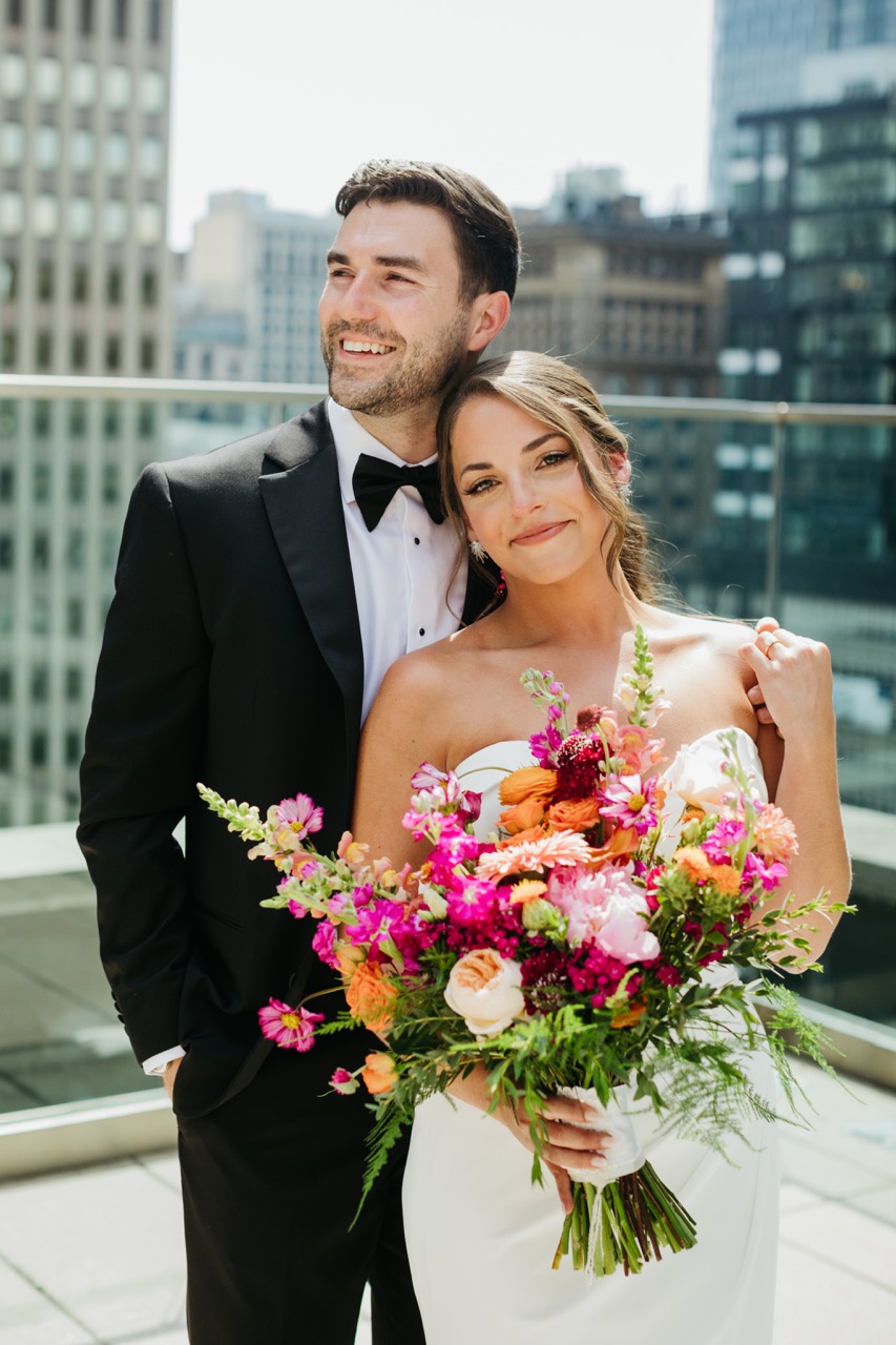When a colorful couple marries in the hard lines of downtown Pittsburgh, it seems fitting for hues and bold shades to pop from start to finish against a black-tie wedding. For Brooke Sender and Rayce Bennett, the challenges of blending two cultural traditions led to lovely layers of tone, flavors, and formality and to leaps of freedom of expression and fun. From the first look on Hotel Monaco’s rooftop deck, to cocktail hour in their foyer, to the reception in the ballroom, playful tones of pinks and oranges, purples and reds, met the ceremonious wedding party with a sentiment of pure joy.