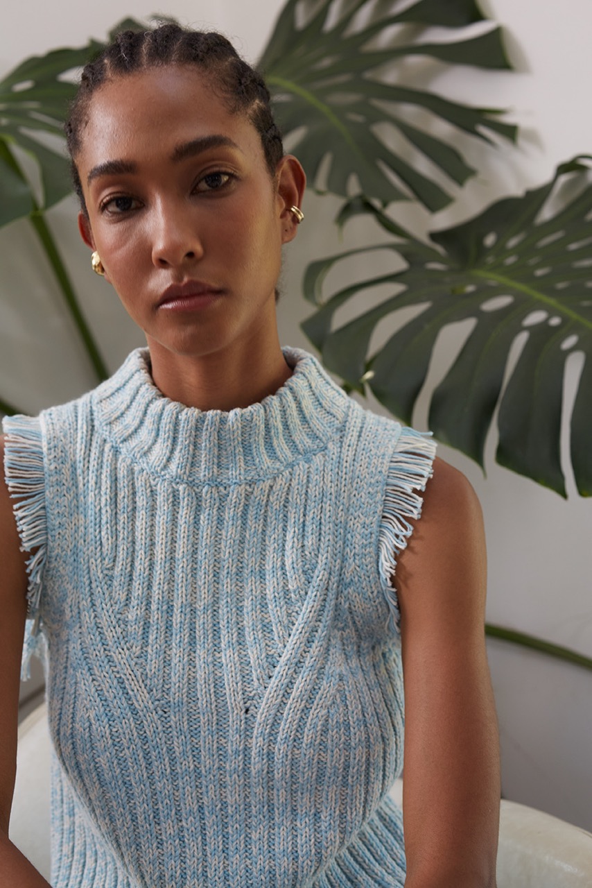 The Bria Ribbed Cotton Fringe Mock Neck Sweater Tank gifts its wearer with a flutter of fringe around the armholes and waist. 100%cotton. Available at Shadyside’s Madeleine George.
