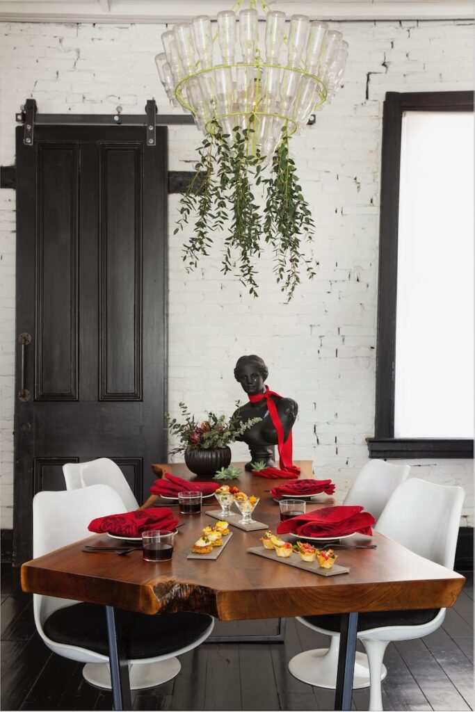 That playful irreverence appears elsewhere, too. A bust of Venus de Milo shows off a Kiss tattoo. Red holiday pillows from North Side neighbor Shannon Pultz and her company Blak Rust brighten the otherwise black-white-gray palette. Floral arrangements by Karrie Hlista Designs bring warmth to Victorian mantels and highlight the grand staircase. Dozens of candles and votives glow through the winter darkness. And of course, one of the family cats—Big Guy or Shy Guy—makes a cameo in front of the camera.