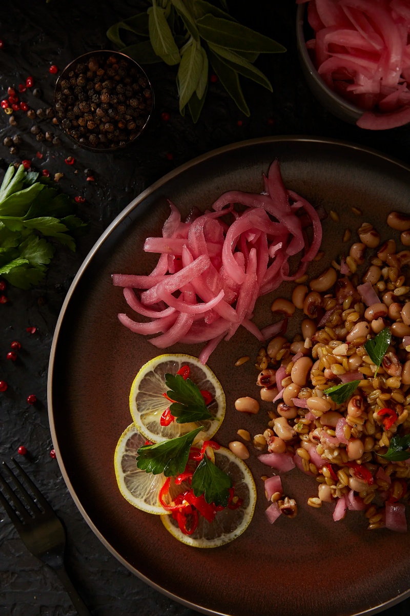 Farro Salad with Black Eyed Peas, Pickled Red Onion, Thyme & Red Chilies
