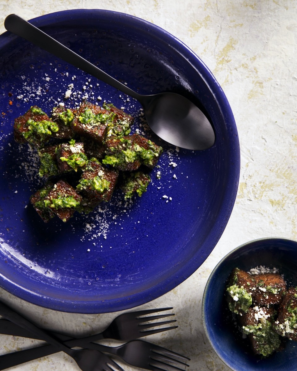 A blue bowl of Gnocchi alla Romana with Pesto Genovese