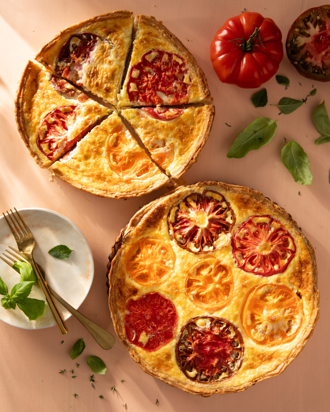 This is a tart that dreams are made of. If your dreams, that is, feature delicately roasted heirloom tomatoes atop a luscious savory custard. It’s worth the time and effort. At the bottom of the tips section of this recipe, I mention spreading a thin layer of pesto atop the baked tart crust. This adds a wonderfully different flavor to the tart. Leaving it out, though, lets the flavor of the tomatoes stand alone. Please go immediately to your favorite source of tomatoes … like multi-generation family business Trax Farms. And stock up on cheddar from Latrobe’s Pleasant Lane Farms.