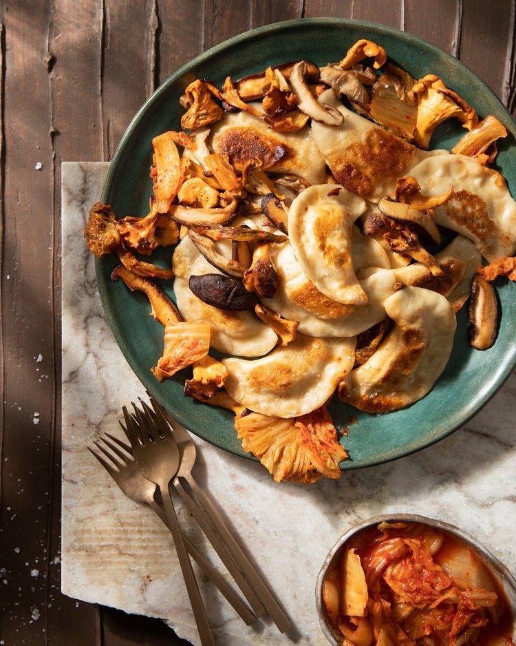 Pittsburgh’s favorite food goes a bit international with purple Japanese sweet potatoes, red pepper flakes, cardamom, cinnamon, ginger, and gentle white onions from Tiny Seed Farm. Served up with gorgeous shiitake and chanterelle mushrooms from Real Fungi LLC, these beauties are a lovely dinner all by themselves.