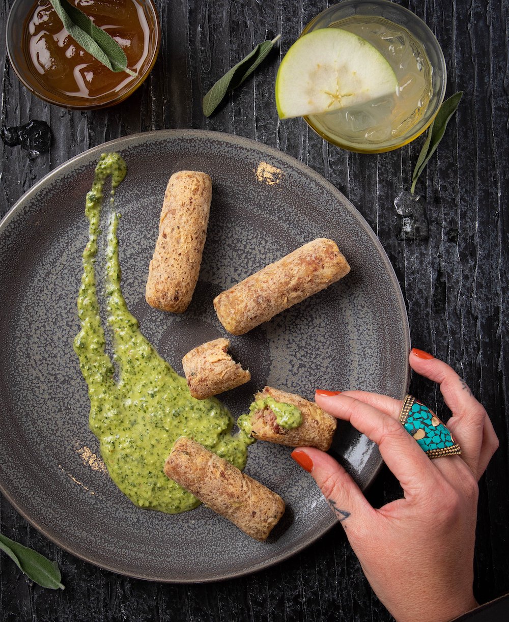 A woman with a ring on her finger picks up a log of Lamb Croquettes off of a grey plate with a green sauce smeared across it.