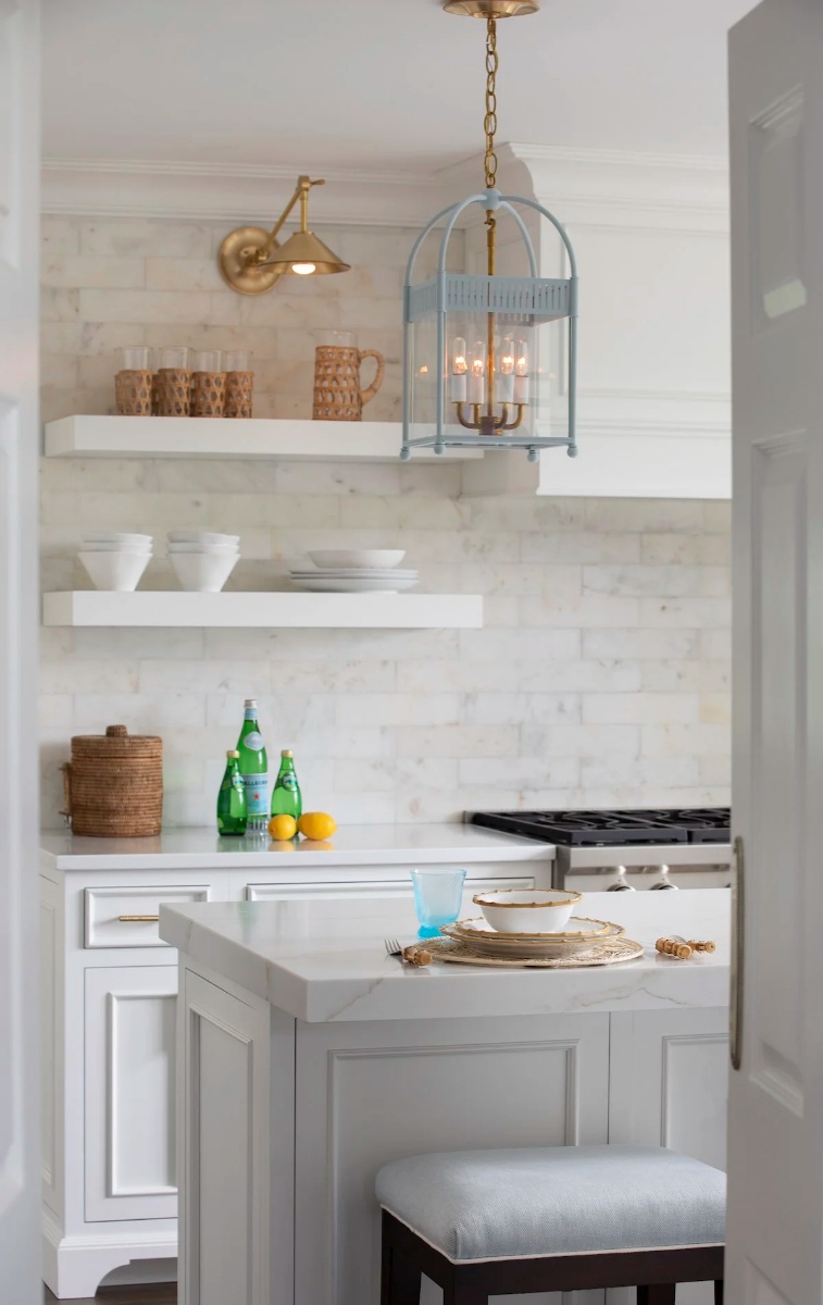Lantern fixtures over the center island by Urban Electric Company are painted in Sherwin Williams Sleepy Blue, the color that accents the adjoining dining room, powder room, and laundry room. Other lighting fixtures are of hewn brass. The faucets on the Franke farm sinks in the living room and laundry room, as well as the cabinet and drawer handles are of satin brass, “much softer and more beautiful than highly polished brass,” Lisa says.