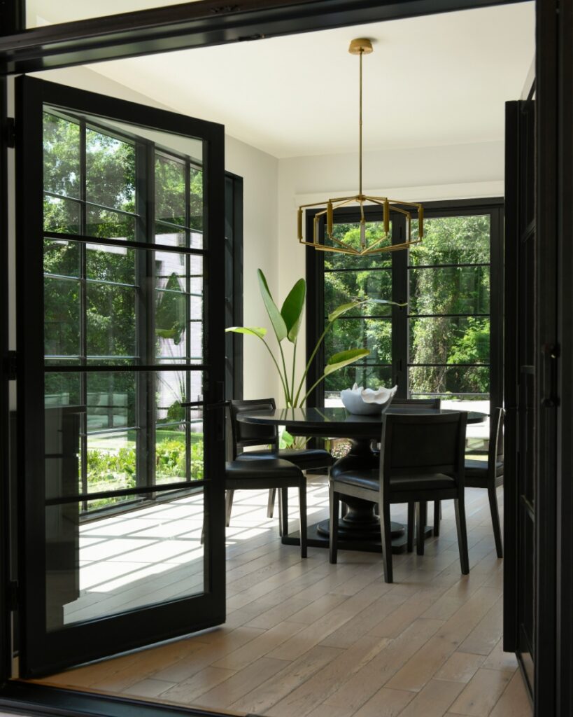 White oak flooring with a rough finish from Mullican along with custom rugs from Weisshouse meld a California casual feel with the Midwest tradition of hardwood. White, black, and gray cabinetry from Cabinetworks Group, countertops by Caesarstone, Datile Porcelain Slabs and HanStone, and tile from Atlas Concord and Tile Bar unify the spaces. Consistent hardware from Amrock, Elements, and Jeffrey Alexander accentuate the flow. Large-paneled black windows and doors by Kolbe/Allegheny Millwork invite the outdoors in.