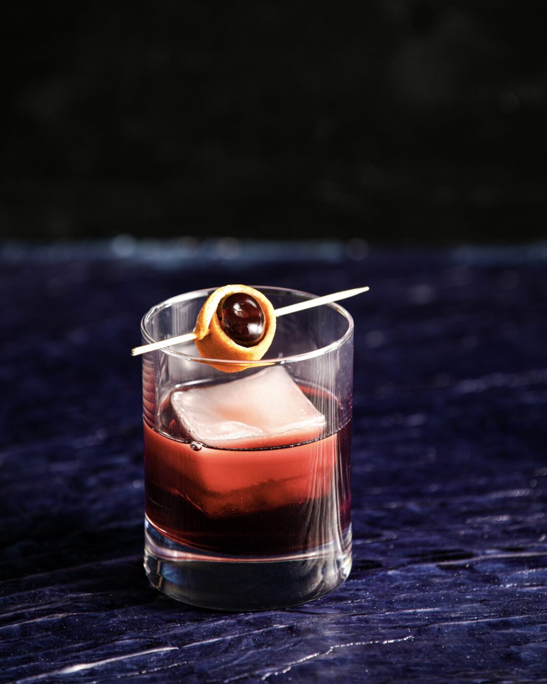 A dark blue and black background with a red, Cherry Tart Negroni cocktail with a square ice cube, garnished with a cherry wrapped in orange peel on a pick.