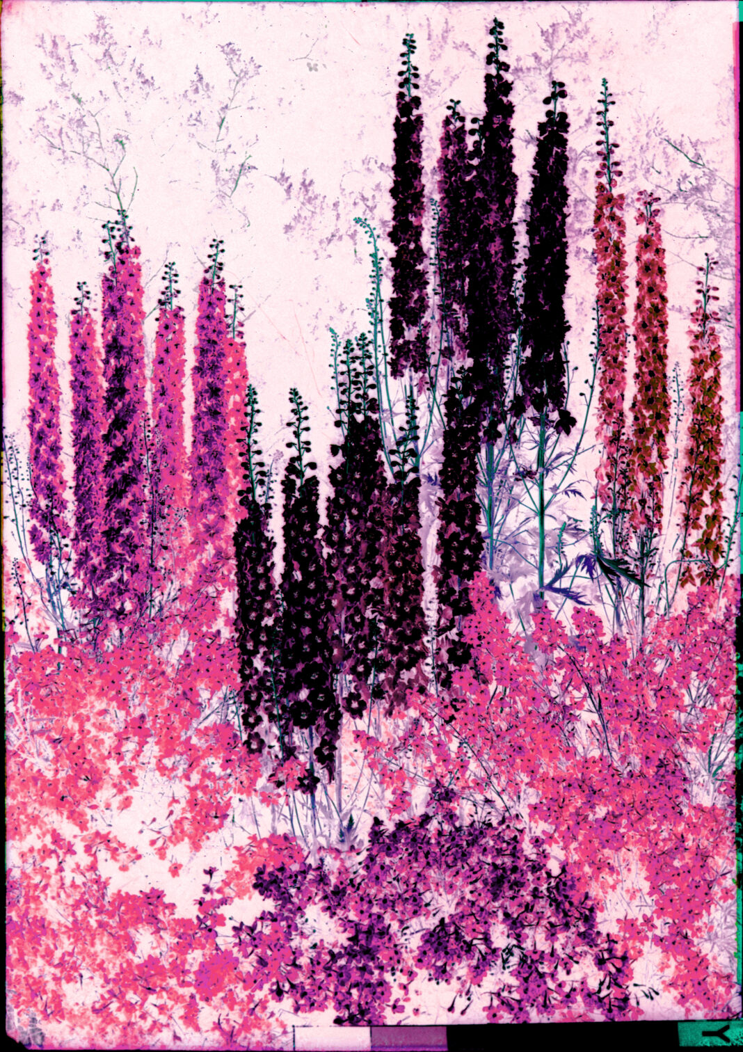 The saturated pinks and blues aside with the fragmentation give an uncanniness to the images. Curator (2021) uses an image of an infant and a snake. The cyan blue of the doctor’s scrubs and the scarlet of the python create an unsettling composition. Atomic Flowers casts Steichen’s career as a delphinium breeder in an overwhelming pink haze on the vinyl wallpaper, colors that bring to mind the paintings of Alison Blickle or Danielle Muzina.