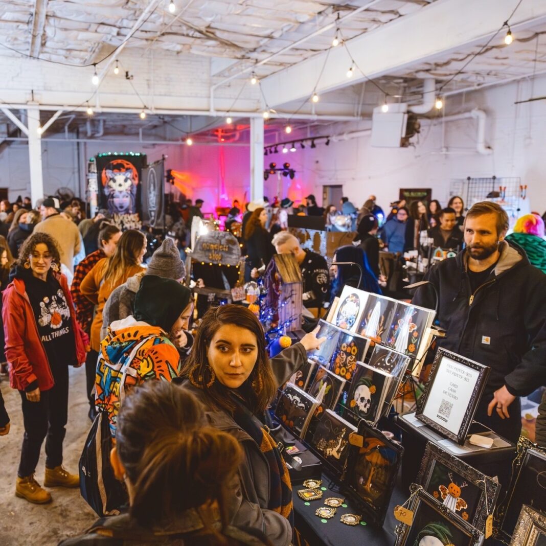 A large group of people look over tables of vendors and crafts at a night market event in Pittsburgh.