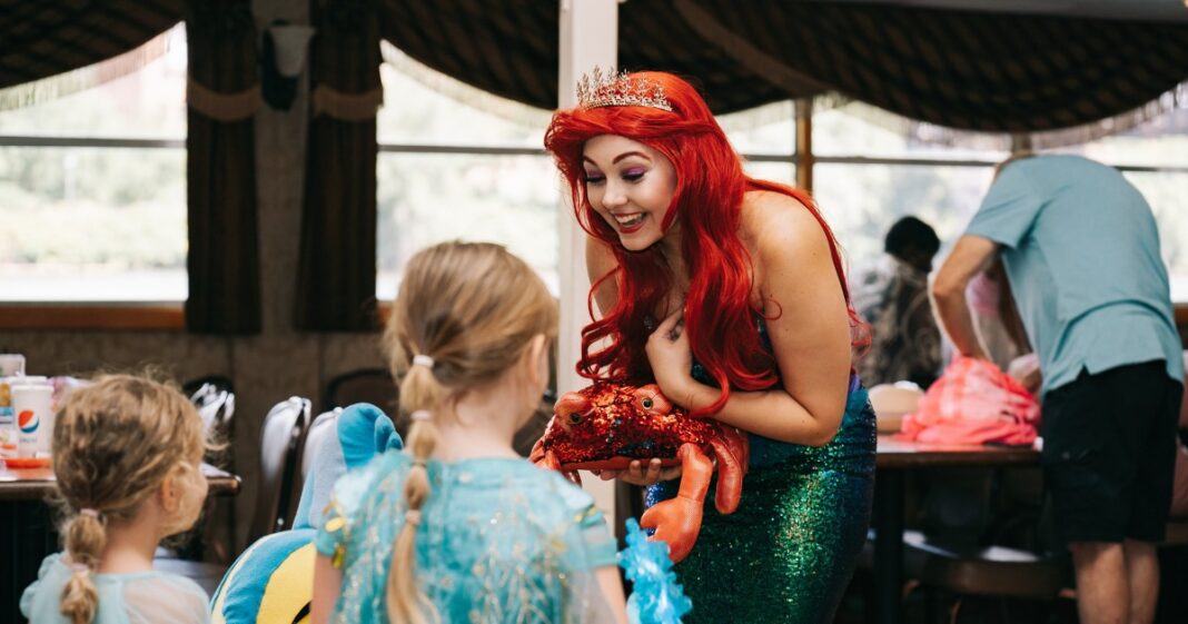 A woman dressed as Ariel from The LIttle Mermaid holds a crab stuffed animal and speaks to little girls in dresses.