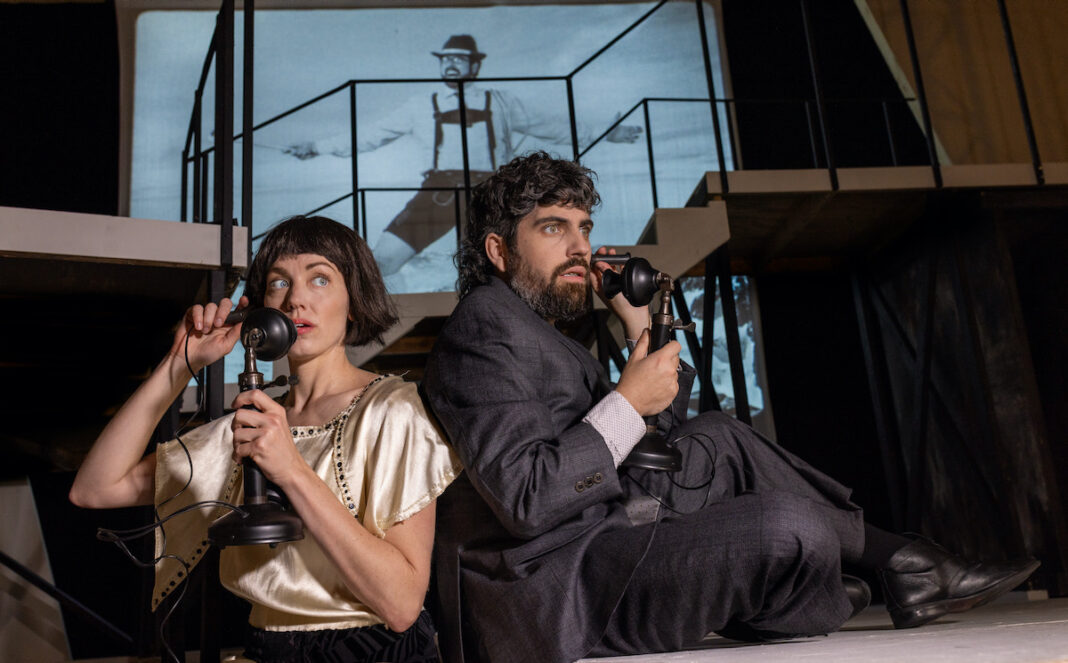 Karla Boos: Well, we couldn’t adapt the film for live theatre without having a very strong visual approach. Anyone who knows the film would expect that! We took inspiration from the dramatic abstract expressionist Franz Kline, and chose a black-and-white palette (also a nod to black and white film) – against which very careful use of color is going to pop. This palette carries through in costumes by Angela Vesco. The space, as usual with Quantum, required us to think outside the box and this long, strange staircase dominates among sharp angles and skewed perspective. The scenic design is by Yafei Hui). Of course there IS film front and center in our show – by the great filmmaker Joe Seamans. It does many different things, from providing story-telling context to special effects to visual jokes!