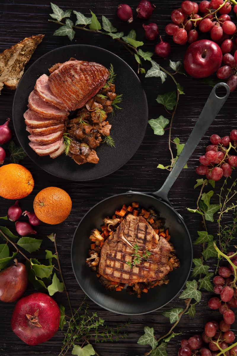 Chef Cory Hughes of Fig & Ash sears farm-raised duck until the skin is perfectly crisp. He pairs the tender meat with a rich mushroom ragout made from cremini, shiitake, and oyster mushrooms. Served over garlic focaccia crostini and topped with fresh herbs, the dish delivers earthy flavor and comforting warmth in every bite.