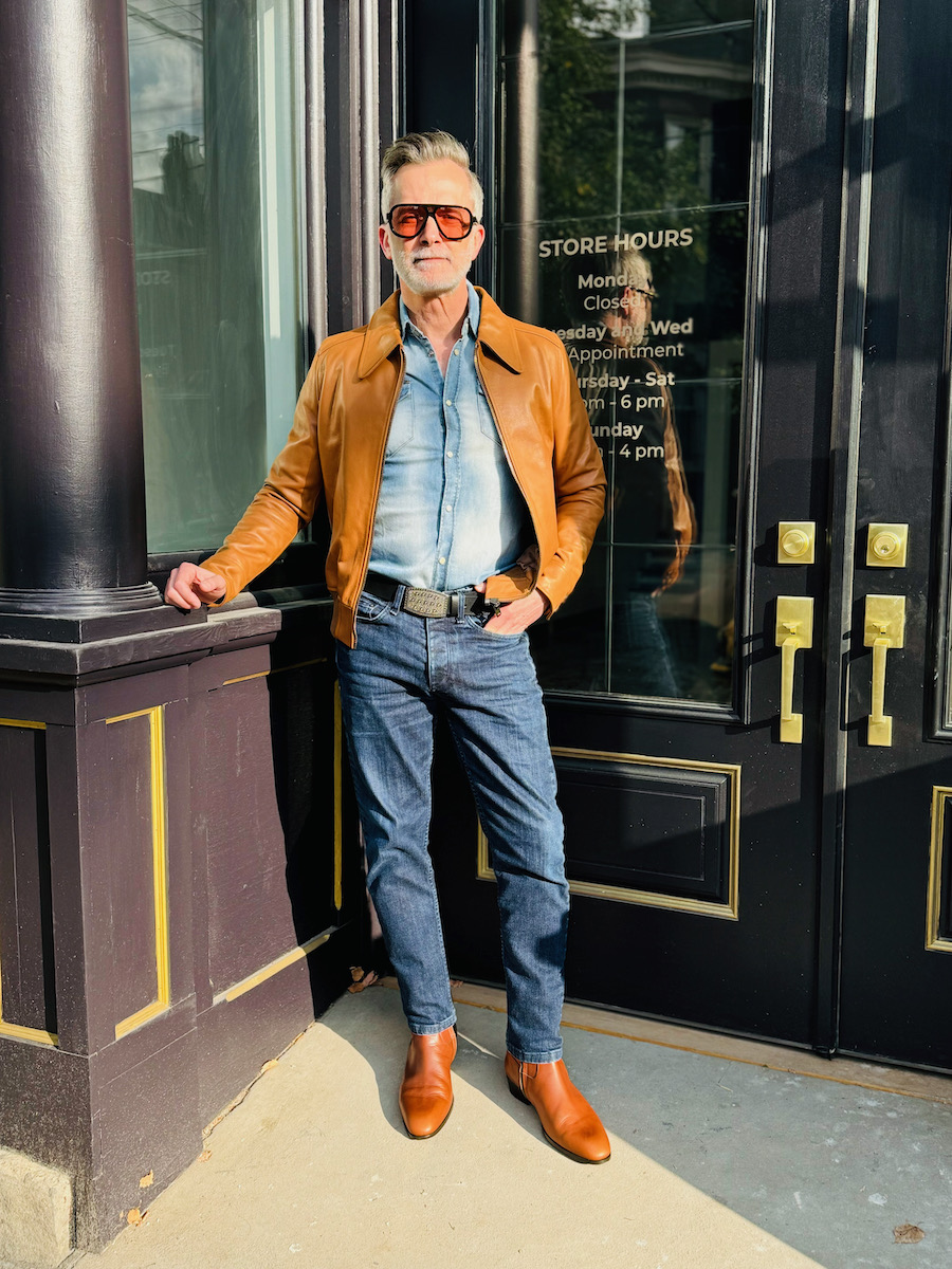 His time as a motorcyclist and love of Ducati and BMW influenced his interest in the Italian spaghetti western style—fringe jackets, flare jeans, mid-calf boots, and large sunglasses. He referenced Italian rock band Måneskin, which rose to prominence in the 2021 Eurovision competition, as a contemporary example of the combination of Italian luxury with western movie grit.