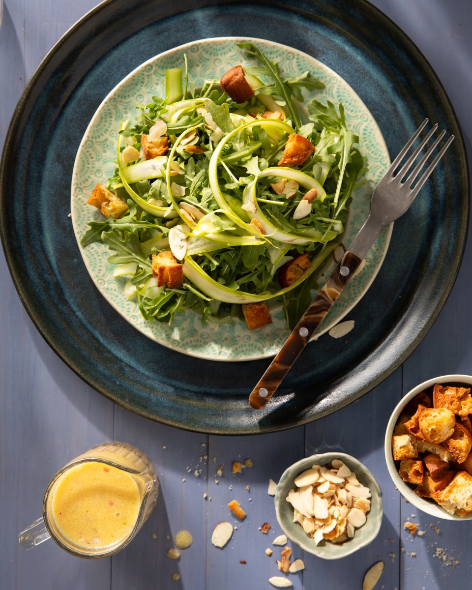 - Pile up the asparagus shavings neatly on a platter or individual plates. Tuck a few arugula leaves around the edges.