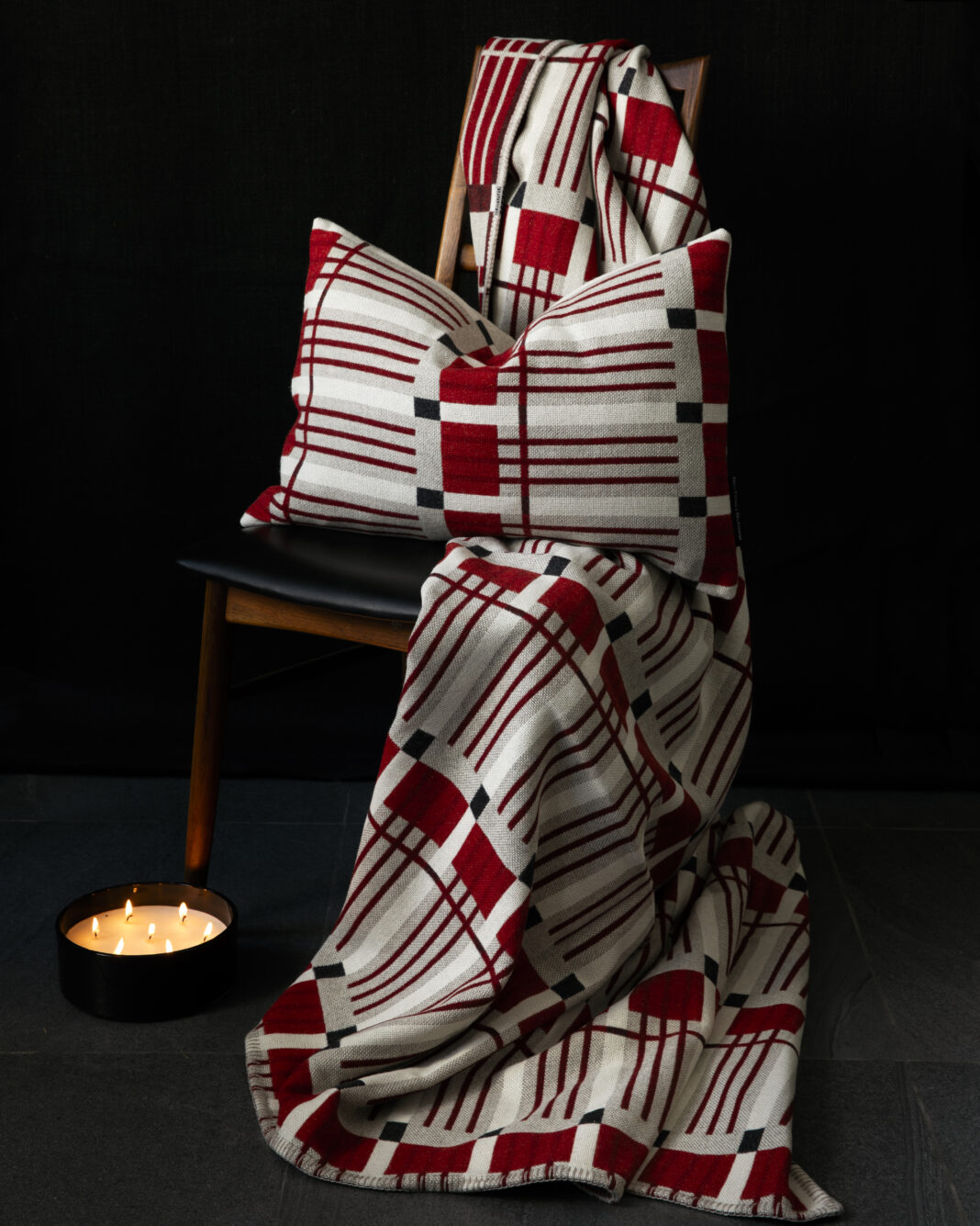 After a week in residence at Frank Lloyd Wright’s Fallingwater, London-based designer and weaver Eleanor Pritchard created Pfenestr, a pattern inspired by the colors, materials, and fenestration of this renowned residence. The design refers to the oxide-red metal window frames and their horizontal design that often run directly into Fallingwater’s stone walls. Limited-edition blankets and cushions are available solely through the museum’s store and website.