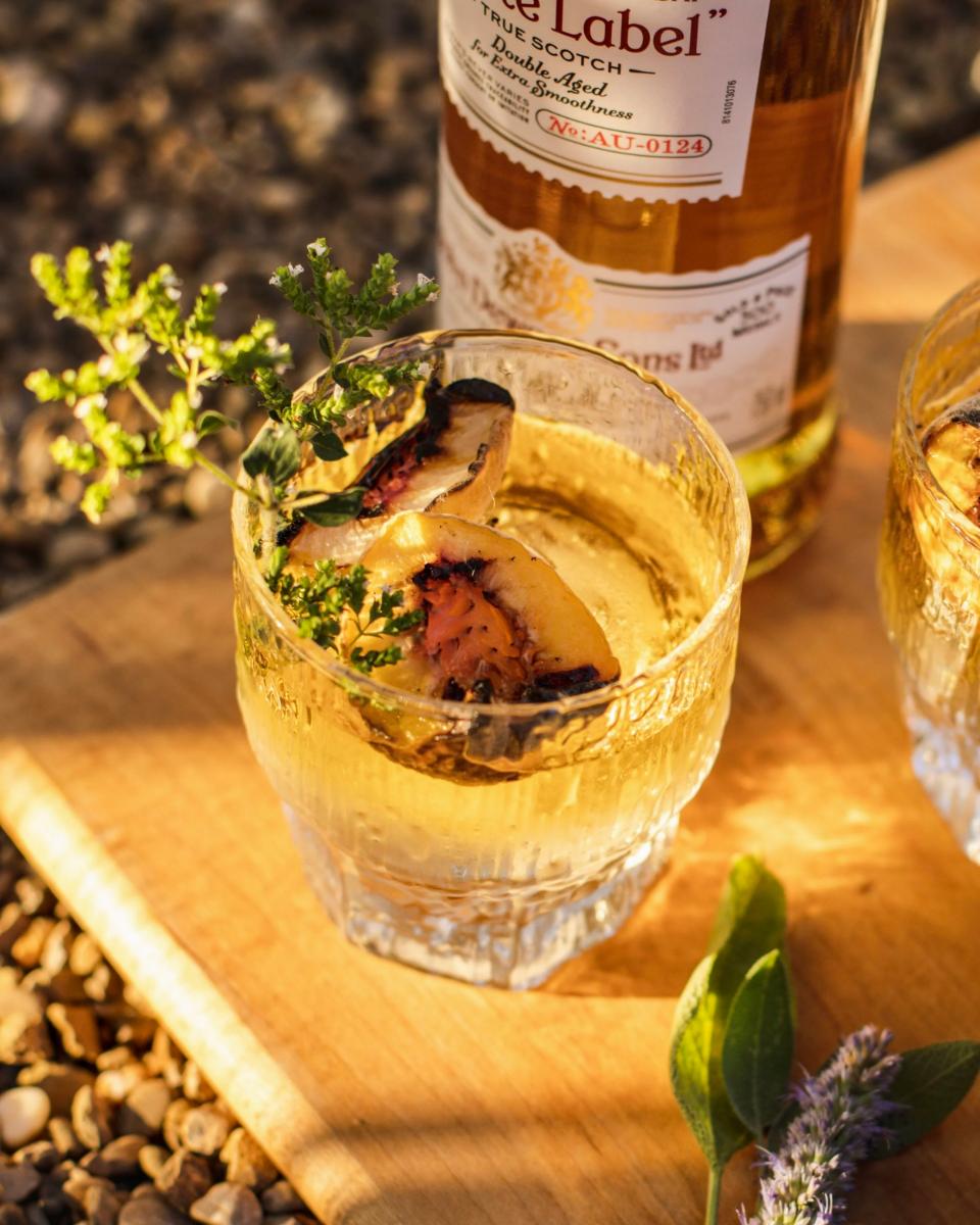 2. Add a single large ice cube, then garnish with grilled peach halves and garden herbs.