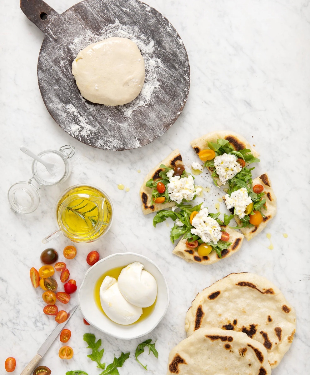 Let’s face it, pizza is intimidating to make at home. We wonder how we can ever attain that perfect pizza crust that is both soft and crunchy without our own wood-burning oven, or a pizza stone, or mad dough tossing skills. Here is the answer: flatbread pizza — on a stovetop. Topped with burrata, arugula, and fresh tomatoes, it’s simple, fresh, and full of flavor. You’ll even make your own dough for the crust, allowing for a perfect texture every single time.