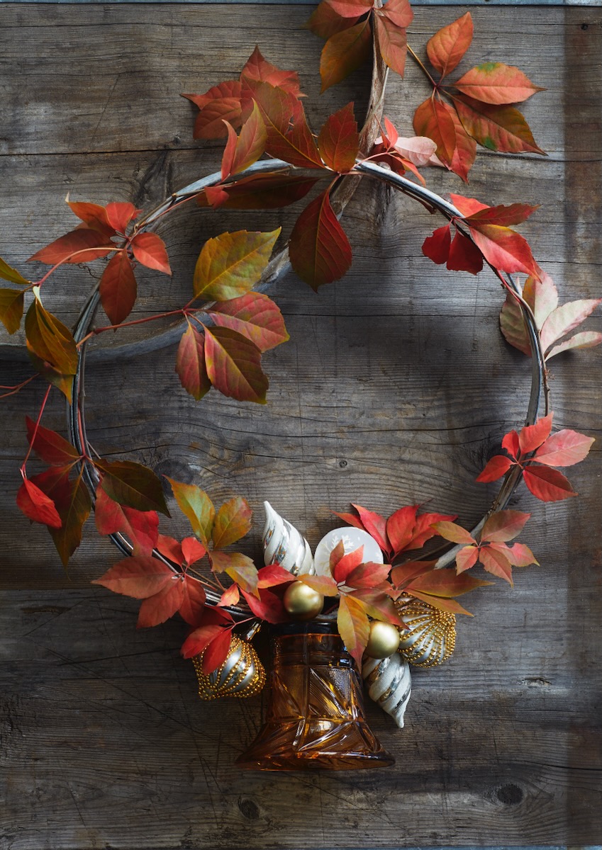 To create a ceiling decoration, make a series of wreaths from cast-off metal bits like old wheels wrapped with twigs and vines. Forage for autumn leaves and winter berries, fix them with wire, and suspend the wreaths at different heights. Add vintage glass baubles for gleam and shine to have Vintage Holiday Style.