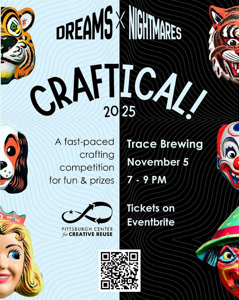 Prizes are provided by local sponsors, and proceeds support Pittsburgh Center for Creative Reuse. All participants must use materials from their Craftical bag, though personal non-electric tools are allowed.
